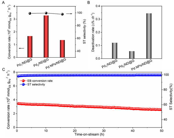 劉洪陽研究團隊近年來一直致力于亞納米尺度金屬催化材料的精準設(shè)計與烷烴高效利用研究,發(fā)表論文2篇。在前期研究工作基礎(chǔ)之上,研究團隊在納米金剛石-石墨烯雜化載體上構(gòu)造了亞納米尺度完全暴露Pd金屬團簇,經(jīng)球差電鏡和X射線吸收精細結(jié)構(gòu)(圖1)分析表明,Pd金屬團簇由平均三個Pd原子組成(Pd3/ND@G)并通過Pd-C鍵錨定在富缺陷石墨烯表面。與Pd單原子和Pd納米顆粒催化劑相比,完全暴露且原子級分散的Pd3金屬團簇催化劑在乙苯低溫脫氫制苯乙烯反應(yīng)中具有最高的乙苯轉(zhuǎn)化率(328 mmol gPd-1h-1)和苯乙烯選擇性(>99%),并且在350 °C無氧反應(yīng)條件下表現(xiàn)出優(yōu)異的穩(wěn)定性(圖2)。密度泛函理論(DFT)計算結(jié)果表明(圖3),Pd3金屬團簇中相鄰金屬Pd原子之間的協(xié)同作用確保了乙苯分子中乙基上C-H 鍵的高效活化和苯乙烯的快速脫附,是Pd3/ND@G催化劑催化性能優(yōu)于Pd單原子和Pd納米顆粒催化劑的關(guān)鍵。本項工作實現(xiàn)了對亞納米尺度Pd金屬團簇結(jié)構(gòu)的精準控制,并為新型烷烴脫氫工業(yè)催化劑的設(shè)計提供了一條新的途徑。