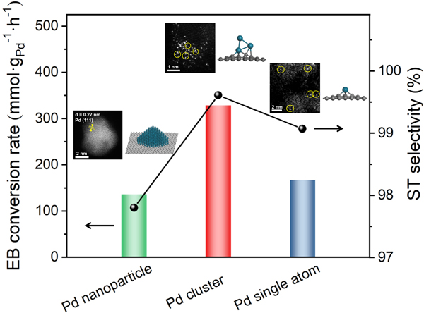 近日,金屬所沈陽材料科學(xué)國家研究中心劉洪陽研究員、刁江勇副研究員和博士研究生王琳琳等人與北京大學(xué)馬丁教授、香港科技大學(xué)王寧教授、中科院上海應(yīng)用物理所姜政研究員以及中科院山西煤化所溫曉東研究員等團隊合作,通過調(diào)控金屬Pd與富缺陷石墨烯載體之間的相互作用,在納米金剛石/石墨烯碳載體上成功構(gòu)建亞納米尺度全暴露Pd3金屬團簇催化劑,該催化劑實現(xiàn)低溫下(350°C)高效催化乙苯直接脫氫制苯乙烯。最近,《美國化學(xué)會催化》(ACS Catalysis) 在線發(fā)表了該項研究成果(DOI:10.1021/acscatal.1c01503)。