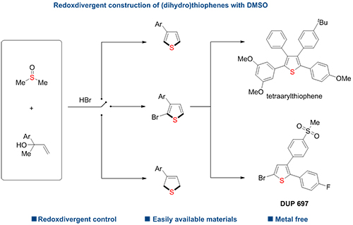 陳慶安團隊一直致力于發(fā)展不同催化體系,以實現(xiàn)烯烴選擇性催化轉(zhuǎn)化與合成。在前期相關研究(Angew. Chem. Int. Ed.,2019;Angew. Chem. Int. Ed.,2020;Angew. Chem. Int. Ed. 2021;Angew. Chem. Int. Ed.,2021)的基礎上,最近,該團隊利用二烯前體烯丙醇和DMSO、HBr為原料,采用氧化還原發(fā)散性的策略構(gòu)建噻吩和二氫噻吩。團隊通過簡單地改變DMSO和HBr的用量來調(diào)控氧化還原程度,從而得到不同氧化還原態(tài)的產(chǎn)物。此外,團隊還進行一系列控制實驗和動力學研究,解釋了反應的機理和氧化還原態(tài)控制的原因。為了進一步驗證該反應的實用性,團隊還進行了一系列的轉(zhuǎn)化實驗,利用(二氫)噻吩產(chǎn)物,能夠得到一系列五元含硫雜環(huán)化合物,尤其是能快速地程序化合成不同四芳基取代的噻吩、環(huán)氧合酶-2(COX-2)抑制劑DUP 697及其區(qū)域異構(gòu)體。