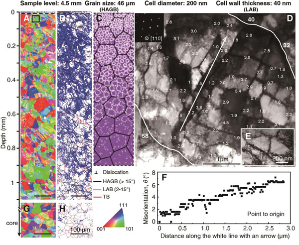 圖1 Al0.1CoCrFeNi高熵合金中典型梯度位錯結(jié)構(gòu)。距離樣品表面1.2 mm內(nèi)(A, B)以及芯部(G, H)的截面EBSD結(jié)果顯示晶粒 (形貌、尺寸、取向)以及內(nèi)部位錯結(jié)構(gòu)在空間上的分布特征;(C) 梯度位錯胞結(jié)構(gòu)示意圖;(D-E) 表層晶粒內(nèi)典型位錯胞TEM結(jié)果顯示平均位錯胞尺寸為200 nm,胞壁取向差介于0.7o -4.8o;(F) 對應(yīng)D圖單個晶粒內(nèi)跨過諸多位錯胞的累積取向差僅為7o。