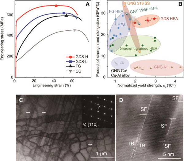 圖2 梯度位錯結(jié)構(gòu)Al0.1CoCrFeNi高熵合金的力學(xué)性能和變形機(jī)制。(A) 拉伸工程應(yīng)力-應(yīng)變曲線;(B) 強(qiáng)塑積與歸一化屈服強(qiáng)度曲線,表明梯度位錯結(jié)構(gòu)高熵合金的綜合力學(xué)性能優(yōu)于相同成分的其它均勻結(jié)構(gòu)和梯度結(jié)構(gòu),同時也優(yōu)于文獻(xiàn)中其它梯度納米晶和梯度納米孿晶結(jié)構(gòu)金屬和合金;(C-D) 拉伸應(yīng)變?yōu)?%時典型變形結(jié)構(gòu)的HAADF-STEM結(jié)果表明梯度位錯結(jié)構(gòu)的塑性變形通過獨(dú)特的超高密度亞十納米層錯和少量孿晶界協(xié)調(diào)。