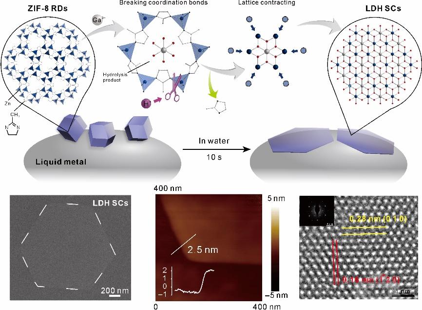 課題組利用液態(tài)金屬鎵(Ga)和母體晶體之間的相互作用,實(shí)現(xiàn)了從三維金屬有機(jī)框架化合物到二維層狀雙金屬氫氧化物之間速度超快、結(jié)構(gòu)大幅變化的單晶—單晶轉(zhuǎn)變,整個(gè)過(guò)程僅需10秒。轉(zhuǎn)變后的子體單晶繼承了母體單晶的有序的金屬原子排列,這意味著可以通過(guò)調(diào)控母體單晶中金屬組成來(lái)設(shè)計(jì)合成含有多種金屬元素的氫氧化物。此外通過(guò)單晶—單晶轉(zhuǎn)變制備得到的二維層狀雙金屬氫氧化物同時(shí)具有超薄和高結(jié)晶性的優(yōu)勢(shì),使其光催化二氧化碳還原的活性得到明顯提升。這種獨(dú)特的單晶轉(zhuǎn)變引發(fā)了對(duì)晶體轉(zhuǎn)變機(jī)制的思考,極大地拓展了單晶—單晶轉(zhuǎn)變領(lǐng)域的研究范圍,同時(shí)也為制備高結(jié)晶性的二維材料提供了新思路。