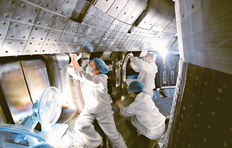 2021年5月28日,中國科學(xué)院合肥物質(zhì)科學(xué)研究院有“人造太陽”之稱的全超導(dǎo)托卡馬克核聚變實驗裝置(EAST)創(chuàng)造新的世界紀(jì)錄,成功實現(xiàn)可重復(fù)的1.2億攝氏度101秒和1.6億攝氏度20秒等離子體運行,向核聚變能源應(yīng)用邁出重要一步。圖為工作人員對全超導(dǎo)托卡馬克核聚變實驗裝置(EAST)進行升級改造。 新華社記者 周牧/攝