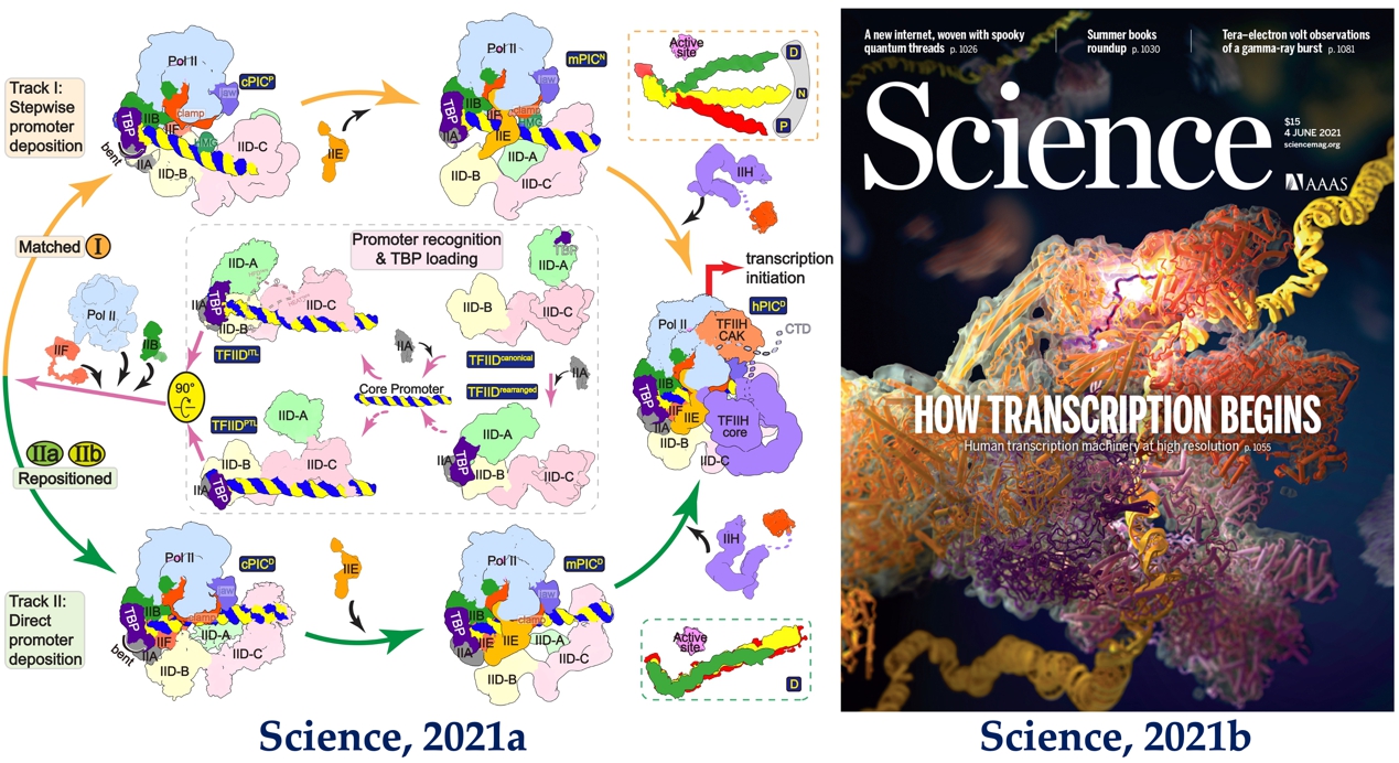 上述成果以2篇研究長(zhǎng)文發(fā)表于《科學(xué)》雜志(Science 372, eaba8490;Science 372, eabg0635),其中一篇被Science雜志選為封面文章,題目為“轉(zhuǎn)錄如何起始”。