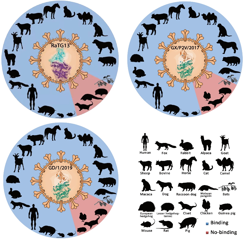 中國(guó)科學(xué)院微生物研究所高福院士團(tuán)隊(duì)建立了高效評(píng)估冠狀病毒跨種識(shí)別能力的方法,利用這些方法對(duì)蝙蝠源性冠狀病毒 RaTG13和穿山甲源性冠狀病毒 GD/1/2019 和 GX/P2V/2017 的跨種傳播潛在風(fēng)險(xiǎn)進(jìn)行評(píng)估,并闡明其跨種識(shí)別的分子機(jī)制,研究發(fā)現(xiàn)上述三種冠狀病毒存在跨種傳播的潛在風(fēng)險(xiǎn),提示我們要持續(xù)對(duì)動(dòng)物源性冠狀病毒進(jìn)行監(jiān)測(cè),預(yù)防新的冠狀病毒引發(fā)疫情,同時(shí)為理解病毒進(jìn)化提供分子基礎(chǔ)。