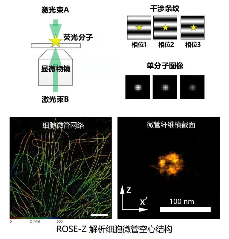 細(xì)胞的生理過(guò)程是由納米尺度的生物分子執(zhí)行的,因此對(duì)生命活動(dòng)更深入的理解需要納米分辨率的成像技術(shù)。中國(guó)科學(xué)院生物物理研究所徐濤院士組和紀(jì)偉研究組組成的技術(shù)攻關(guān)團(tuán)隊(duì),一直聚焦于突破光學(xué)顯微成像分辨率的研究,前期發(fā)展的ROSE顯微鏡把側(cè)向(X-Y)分辨率提高到納米水平(Nature Methods,2019),基于干涉定位創(chuàng)新原理又研制出ROSE-Z顯微鏡,進(jìn)一步突破了軸向(Z)分辨率,可解析納米尺度的亞細(xì)胞結(jié)構(gòu),為生命科學(xué)研究提供了有力工具。該研究表明光學(xué)顯微鏡已經(jīng)步入納米分辨率時(shí)代,我國(guó)科學(xué)家在該領(lǐng)域具備多學(xué)科交叉技術(shù)創(chuàng)新能力,研制的具有自主知識(shí)產(chǎn)權(quán)的新型超分辨成像設(shè)備處于國(guó)際領(lǐng)先地位。
