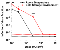 圖1 254 nm UVC在低溫(-20℃)和室溫(23℃)下對小鼠肝炎病毒(MHV-A59)的滅活