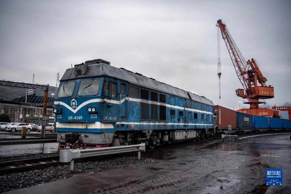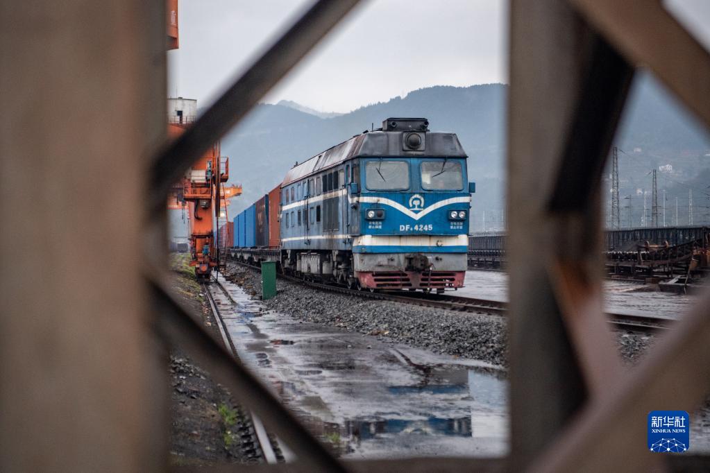 2月19日,作業(yè)車(chē)輛在重慶果園港牽引中歐班列進(jìn)行裝載作業(yè)。新華社記者 唐奕 攝