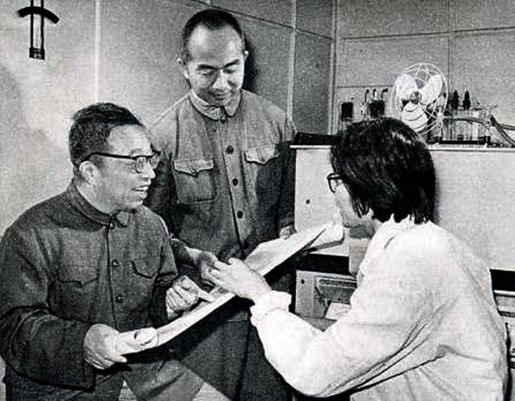 圖19:唐敖慶(左)同江元生(中)等一起研究一種分子的光譜圖
