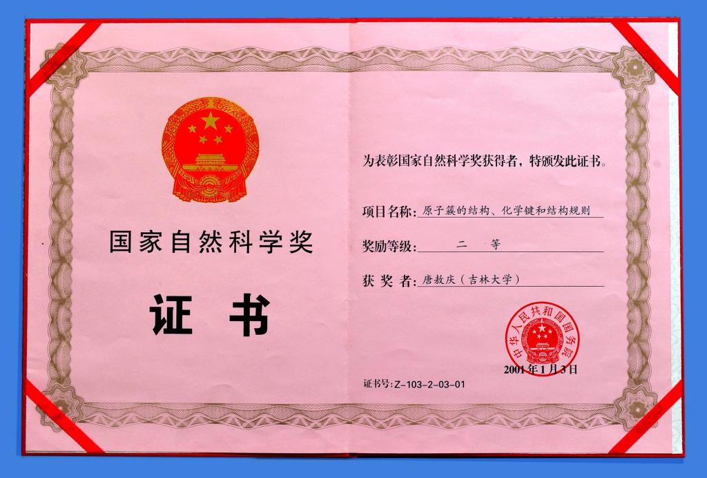 到20世紀(jì)90年代,唐敖慶已是耄耋老人,但他不顧年邁體弱,仍和他的研究集體開(kāi)展高碳原子簇化學(xué)的理論研究。這項(xiàng)研究所取得的主要成果為原子簇化合物的分子設(shè)計(jì)和合成提供了理論依據(jù)。“原子簇結(jié)構(gòu)、化學(xué)鍵和結(jié)構(gòu)規(guī)則”這一重要研究成果獲2000年國(guó)家自然科學(xué)獎(jiǎng)二等獎(jiǎng)。該科研成果已撰寫(xiě)成專(zhuān)著《原子簇的結(jié)構(gòu)規(guī)則和化學(xué)鍵》,由山東科學(xué)技術(shù)出版社于1998年出版。