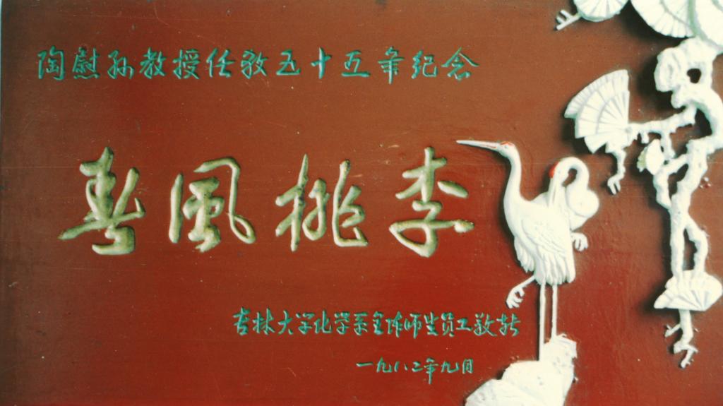 圖12:1982年,吉林大學(xué)化學(xué)系為執(zhí)教55年的陶慰孫授“春風(fēng)桃李”牌匾