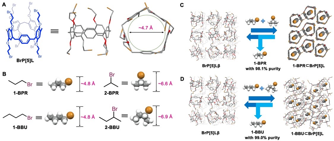 圖一:A,B,精巧型柱[5]芳烴衍生物BrP[5]L以及1-溴丙烷、2-溴丙烷、1-溴丁烷以及2-溴丁烷的分子結(jié)構(gòu);C,D,利用BrP[5]L無(wú)定形材料實(shí)現(xiàn)鹵代烴異構(gòu)體高選擇性吸附分離示意圖。