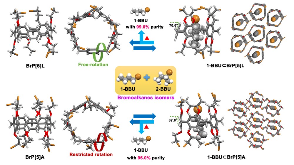 在前期的工作中,該課題組設(shè)計(jì)合成了一例“骨架精簡(jiǎn)版的”甲基柱[5]芳烴衍生物,即精巧型甲基柱[5]芳烴(permethylated leggero pillar[5]arene),并進(jìn)一步在固相條件下實(shí)現(xiàn)了對(duì)其分子堆積從無(wú)序到有序(無(wú)定形態(tài)至晶態(tài))的精準(zhǔn)調(diào)控(J. Am. Chem. Soc.2021,143, 20395)。在此研究工作基礎(chǔ)之上,該課題組成功設(shè)計(jì)并合成了一種全溴乙基取代的精巧型柱[5]芳烴衍生物(perbromoethylated leggero pillar[5]arene,簡(jiǎn)稱為BrP[5]L),隨后通過(guò)客體誘導(dǎo)的方式實(shí)現(xiàn)了對(duì)其固相分子堆積從無(wú)序到有序的精準(zhǔn)調(diào)控并同時(shí)利用該過(guò)程實(shí)現(xiàn)了對(duì)鹵代烴位置異構(gòu)體的高精準(zhǔn)式吸附與分離應(yīng)用(圖一)。實(shí)驗(yàn)結(jié)果表明,無(wú)定形且無(wú)孔的BrP[5]L粉末可以通過(guò)固相主客體相互作用來(lái)吸附多種溴代烷烴蒸汽(1-溴丙烷、2-溴丙烷、1-溴丁烷以及2-溴丁烷),進(jìn)而構(gòu)筑得到多種溴代烷絡(luò)合形式的有序超分子組裝體。同時(shí),作者發(fā)現(xiàn)1-溴代烷和2-溴代烷與BrP[5]L之間所形成的固相主客體絡(luò)合結(jié)構(gòu)具有不同的鍵合模式以及熱力學(xué)穩(wěn)定性差異,這使得無(wú)定形BrP[5]L粉末在1-/2-溴代烷烴位置異構(gòu)體的吸附分離方面展現(xiàn)出了巨大的應(yīng)用潛力。
