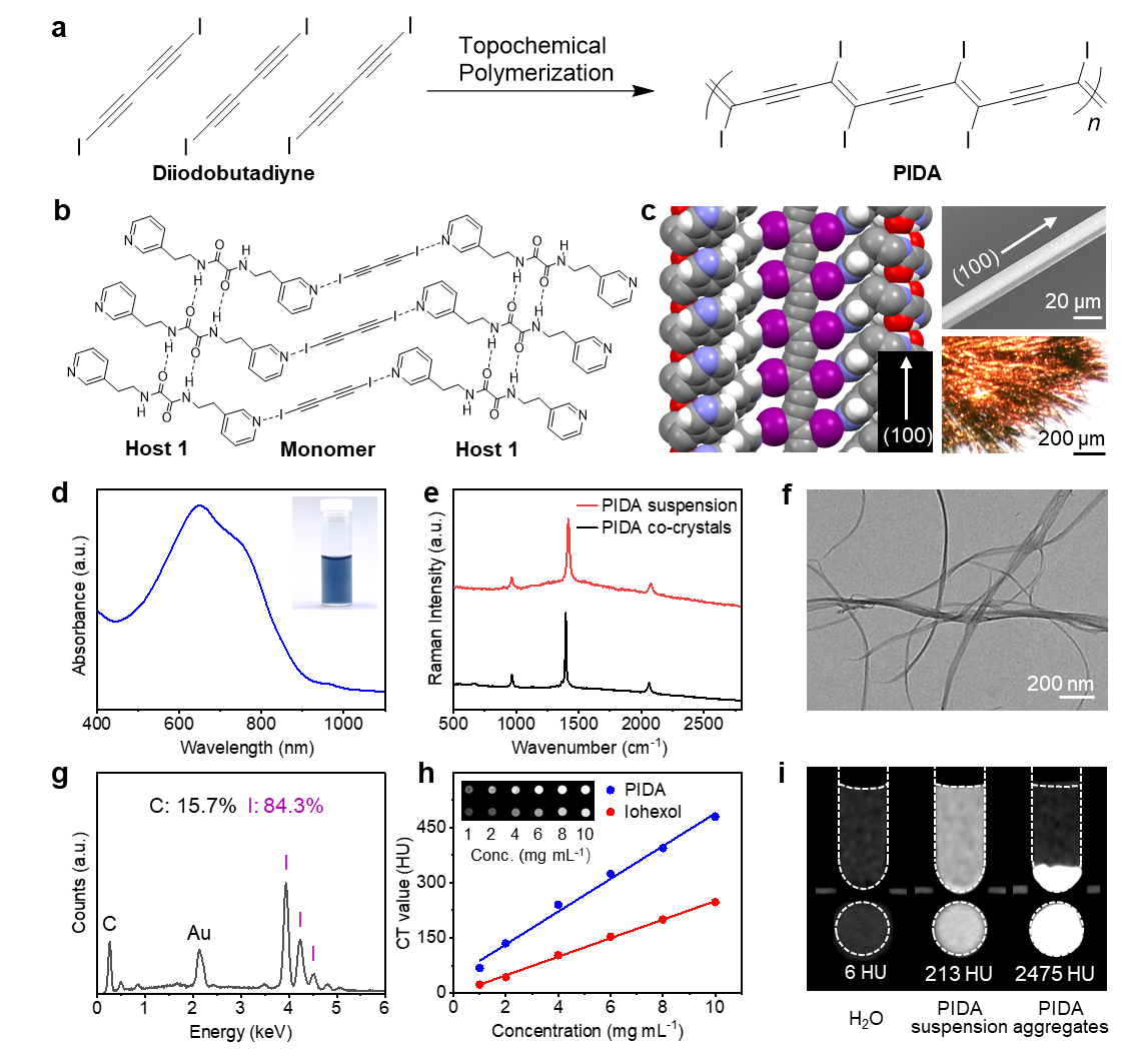 在這項(xiàng)研究中,研究人員首先將單體diiodobutadiyne與模板分子進(jìn)行適當(dāng)?shù)目臻g排列組裝,通過拓?fù)浠瘜W(xué)聚合制備了一種僅由碳碘組成的共軛高分子PIDA。PIDA具有超高含碘量 (>84 wt%) , 可賦予其前所未有的X 射線衰減能力。并且PIDA可形成納米纖維,其在水介質(zhì)中的CT信號(hào)表現(xiàn)出聚集誘導(dǎo)放大效應(yīng),可進(jìn)一步增大10倍以上。