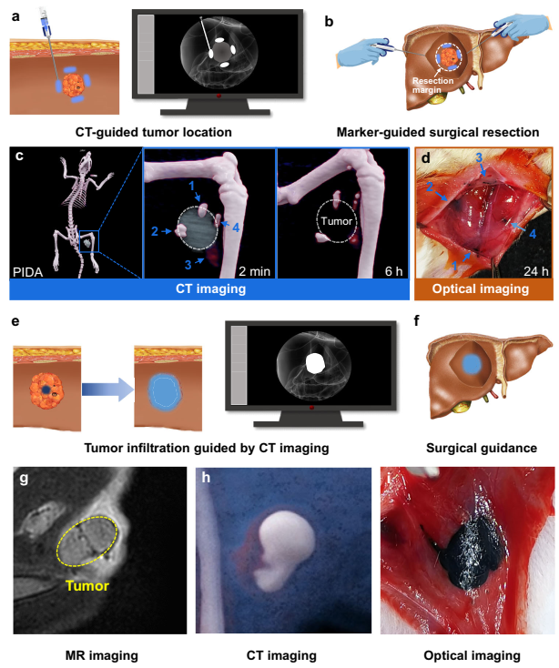 計(jì)算機(jī)斷層掃描 (CT) 是目前最常用的疾病診斷和治療引導(dǎo)技術(shù)之一,基于CT造影劑的增強(qiáng)CT可以精準(zhǔn)鑒定微小腫瘤病灶,然而依據(jù)CT造影結(jié)果在腫瘤手術(shù)切除時(shí)精確界定腫瘤切緣卻十分困難。大多數(shù)碘造影劑的清除速度過快導(dǎo)致有效性不足,而金屬造影劑則受到強(qiáng)烈的成像偽影干擾并具有生物安全問題。此外,絕大部分CT造影劑肉眼難以識(shí)別,因而嚴(yán)重限制了手術(shù)過程中對(duì)腫瘤邊緣輪廓的界定。如何將CT診斷結(jié)果精準(zhǔn)、實(shí)時(shí)地轉(zhuǎn)化為治療干預(yù)是目前亟需解決的重大臨床問題。