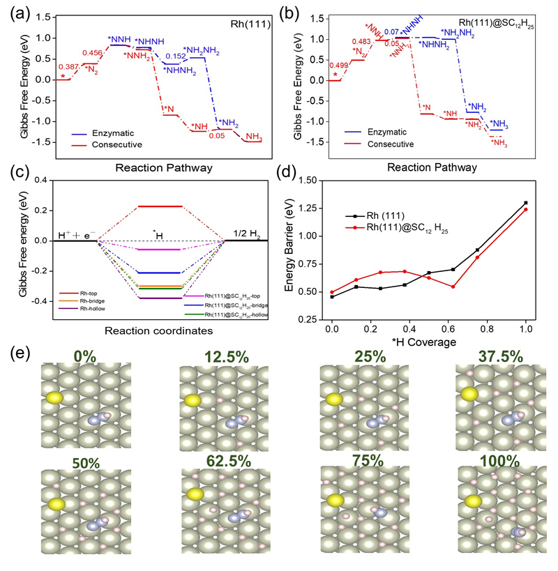 圖2. (a)Rh(111);(b)Rh(111)@SC12H25上NRR過(guò)程吉布斯自由能圖;(c)HER過(guò)程吉布斯自由能圖;(d)不同氫覆蓋度下N2加氫能壘;(e)氫覆蓋度示意圖。