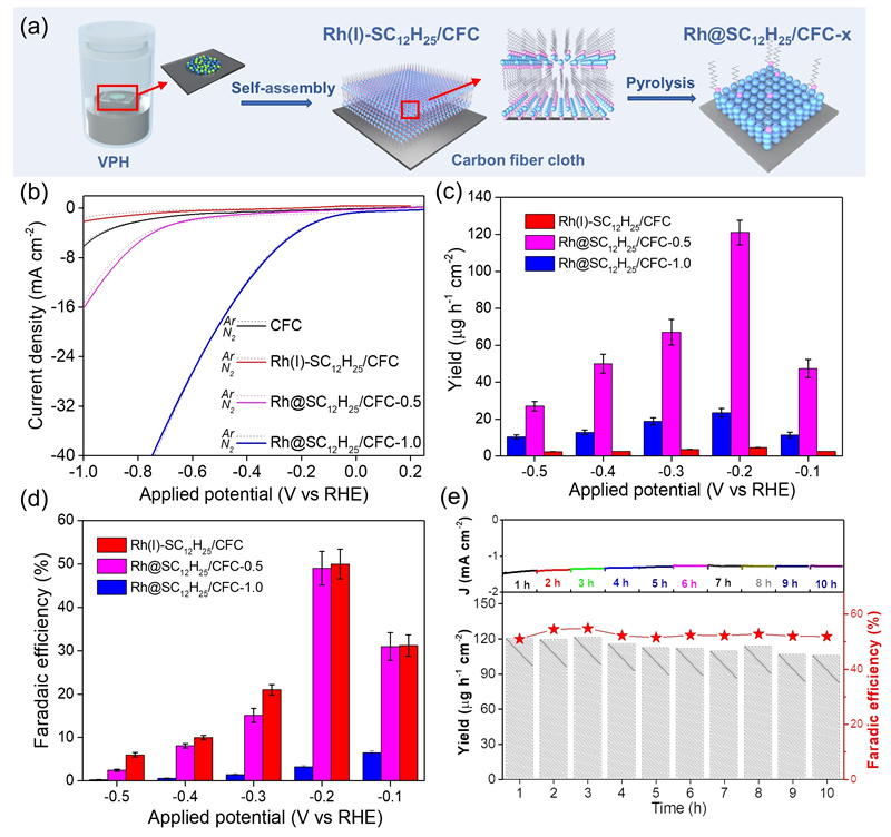 圖1. (a)Rh@SC12H25/CFC-x催化劑的制備示意圖。(b)Rh(I)-SC12H25/CFC、Rh@SC12H25/CFC-0.5、Rh@SC12H25/CFC-1.0、CFC電極分別在Ar和N2飽和的0.1 M Na2SO4溶液中的LSV曲線;Rh(I)-SC12H25/CFC、Rh@SC12H25/CFC-0.5、Rh@SC12H25/CFC-1.0電極在不同電位下氨生成(c)產(chǎn)率;(d)法拉第效率;(e)Rh@SC12H25/CFC-0.5在-0.2 V過(guò)電位下循環(huán)反應(yīng)10次對(duì)應(yīng)的產(chǎn)率、法拉第效率、陰極電流。