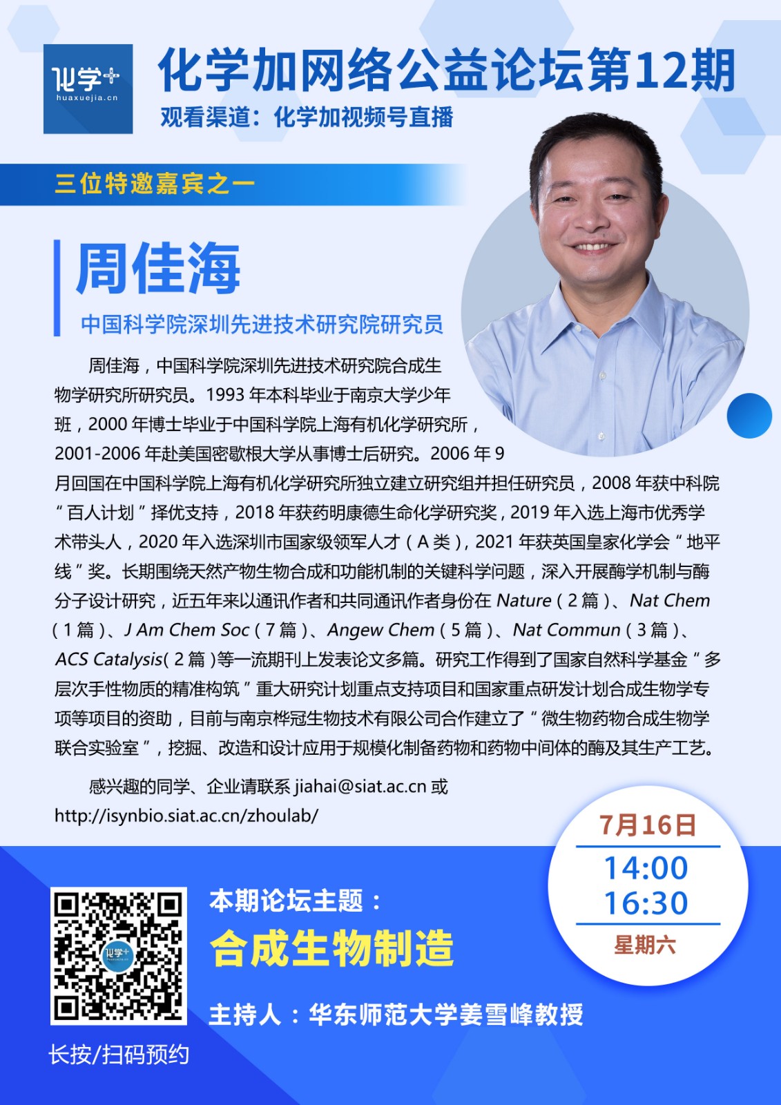 周佳海,中國(guó)科學(xué)院深圳先進(jìn)技術(shù)研究院合成生物學(xué)研究所研究員。1993年本科畢業(yè)于南京大學(xué)少年班,2000年博士畢業(yè)于中國(guó)科學(xué)院上海有機(jī)化學(xué)研究所,2001-2006年赴美國(guó)密歇根大學(xué)從事博士后研究。2006年9月回國(guó)在中國(guó)科學(xué)院上海有機(jī)化學(xué)研究所獨(dú)立建立研究組并擔(dān)任研究員,2008年獲中科院“百人計(jì)劃”擇優(yōu)支持,2018年獲藥明康德生命化學(xué)研究獎(jiǎng), 2019年入選上海市優(yōu)秀學(xué)術(shù)帶頭人,2020年入選深圳市國(guó)家級(jí)領(lǐng)軍人才(A類),2021年獲英國(guó)皇家化學(xué)會(huì)“地平線”獎(jiǎng)。長(zhǎng)期圍繞天然產(chǎn)物生物合成和功能機(jī)制的關(guān)鍵科學(xué)問題,深入開展酶學(xué)機(jī)制與酶分子設(shè)計(jì)研究,近五年來以通訊作者和共同通訊作者身份在Nature(2篇)、Nat Chem(1篇)、J Am Chem Soc(7篇)、Angew Chem(5篇)、Nat Commun(3篇)、ACS Catalysis(2篇)等一流期刊上發(fā)表論文多篇。研究工作得到了國(guó)家自然科學(xué)基金“多層次手性物質(zhì)的精準(zhǔn)構(gòu)筑”重大研究計(jì)劃重點(diǎn)支持項(xiàng)目和國(guó)家重點(diǎn)研發(fā)計(jì)劃合成生物學(xué)專項(xiàng)等項(xiàng)目的資助,目前與南京樺冠生物技術(shù)有限公司合作建立了“微生物藥物合成生物學(xué)聯(lián)合實(shí)驗(yàn)室”,挖掘、改造和設(shè)計(jì)應(yīng)用于規(guī)?;苽渌幬锖退幬镏虚g體的酶及其生產(chǎn)工藝。