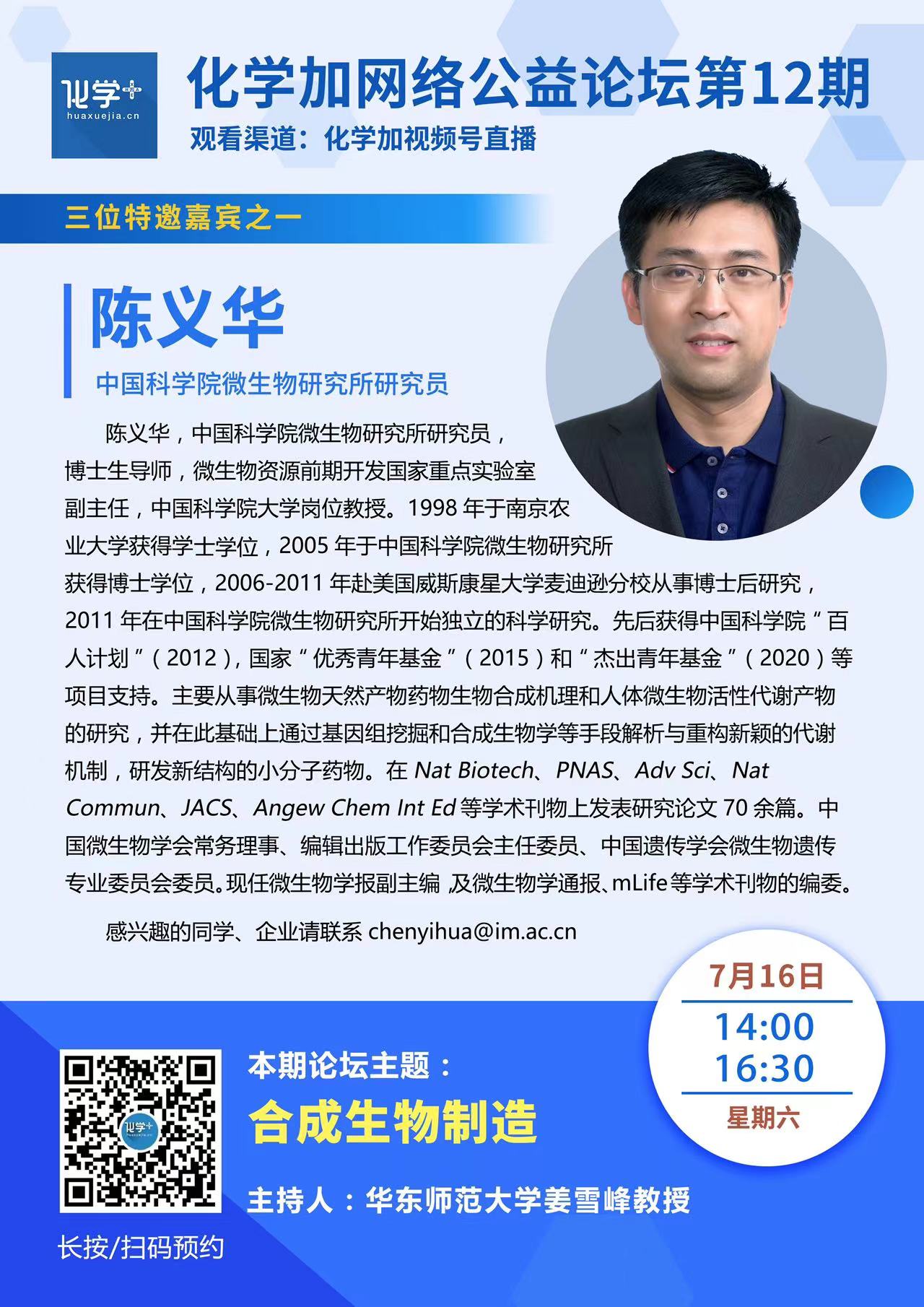 陳義華,中國(guó)科學(xué)院微生物研究所研究員,博士生導(dǎo)師,微生物資源前期開發(fā)國(guó)家重點(diǎn)實(shí)驗(yàn)室副主任,中國(guó)科學(xué)院大學(xué)崗位教授。1998年于南京農(nóng)業(yè)大學(xué)獲得學(xué)士學(xué)位,2005年于中國(guó)科學(xué)院微生物研究所獲得博士學(xué)位,2006-2011年赴美國(guó)威斯康星大學(xué)麥迪遜分校從事博士后研究,2011年在中國(guó)科學(xué)院微生物研究所開始獨(dú)立的科學(xué)研究。先后獲得中國(guó)科學(xué)院“百人計(jì)劃”(2012),國(guó)家“優(yōu)秀青年基金”(2015)和“杰出青年基金”(2020)等項(xiàng)目支持。主要從事微生物天然產(chǎn)物藥物生物合成機(jī)理和人體微生物活性代謝產(chǎn)物的研究,并在此基礎(chǔ)上通過基因組挖掘和合成生物學(xué)等手段解析與重構(gòu)新穎的代謝機(jī)制,研發(fā)新結(jié)構(gòu)的小分子藥物。在Nat Biotech、PNAS、Adv Sci、Nat Commun、JACS、Angew Chem Int Ed等學(xué)術(shù)刊物上發(fā)表研究論文70余篇。中國(guó)微生物學(xué)會(huì)常務(wù)理事、編輯出版工作委員會(huì)主任委員、中國(guó)遺傳學(xué)會(huì)微生物遺傳專業(yè)委員會(huì)委員?,F(xiàn)任微生物學(xué)報(bào)副主編,及微生物學(xué)通報(bào)、mLife等學(xué)術(shù)刊物的編委。