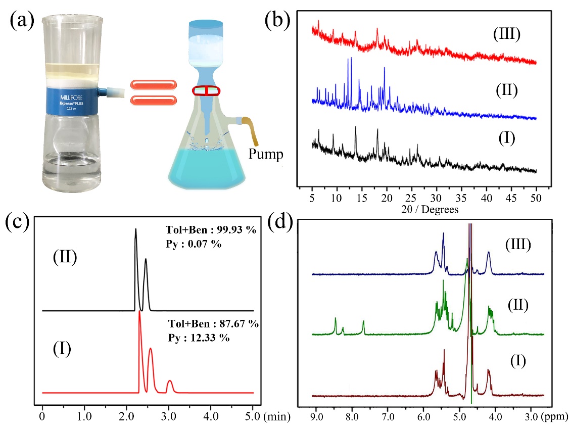 苯、甲苯和吡啶是工業(yè)和實(shí)驗(yàn)室研究中廣泛使用的重要原料,對(duì)純度有嚴(yán)格的要求。在工業(yè)上,甲苯和苯通過(guò)煤焦化和蒸餾過(guò)程生產(chǎn),但經(jīng)常含有少量的吡啶,必須將其去除。然而,由于它們相似的物理性質(zhì),甲苯和苯都易與吡啶形成共沸物,這給它們的分離和純化帶來(lái)了極大的技術(shù)挑戰(zhàn)。目前采用的分離方法主要為能源密集型蒸餾的方法,但這些方法存在成本高、能量高、技術(shù)復(fù)雜等缺點(diǎn),因此,開(kāi)發(fā)節(jié)能、簡(jiǎn)便、高效的分離方法是迫切的社會(huì)需求。在此,課題組采用了雙空腔錯(cuò)位十元瓜環(huán)作為一種吸附、分離材料,將其應(yīng)用于吡啶、苯和甲苯的分離,構(gòu)建了一種節(jié)能、便捷且環(huán)保的分離方法,該方法可得到純度為99.9% 的苯和甲苯。該方法的創(chuàng)新性及優(yōu)異性主要體現(xiàn)在:1、雙空腔錯(cuò)位十元瓜環(huán)體積大(740?3)、容量大、兩個(gè)腔體,遠(yuǎn)優(yōu)異于普通瓜環(huán)空腔體積小,腔體單一的特點(diǎn);2、雙空腔錯(cuò)位十元瓜環(huán)與吡啶分子間存在大量的氫鍵作用,結(jié)合力強(qiáng),吸附性能優(yōu)越;3、通過(guò)熱處理可將吡啶分子從瓜環(huán)中有效解析出來(lái),從而對(duì)瓜環(huán)多次循環(huán)使用,而不影響其進(jìn)一步使用性能;4、能夠有效將吡啶從吡啶/苯、吡啶/甲苯、吡啶/苯/甲苯中分離出來(lái),得到高純度的苯和甲苯(99.9%)。圖1:吡啶從甲苯和苯中分離以及回收過(guò)程的示意圖。圖2:利用X-單晶衍射分析ns-Q[10]·Py2的結(jié)構(gòu)。圖2a、b和c詳細(xì)描述了不同方向的二維視圖(a:沿a軸向下,b、沿b軸向下,c、沿c軸向下),(d) 突出顯示了ns-Q[10]和Py分子間的作用力。圖3:(a) Tol/Ben/Py分離實(shí)際使用的器件及其示意圖;(b) ns-Q[10]在Tol/Ben/Py分離前后的PXRD譜圖;(c) Tol/Ben/Py分離前后的GC表征;(d) ns-Q[10]分離Tol/Ben/Py前后的1H NMR譜。圖4:以雙腔大環(huán)化合物ns-Q[10]作為吸附分離器的核心元件,促進(jìn)了甲苯和苯中吡啶的去除。該研究論文第一作者為2020級(jí)博士研究生劉明,導(dǎo)師肖昕教授和美國(guó)馬里蘭大學(xué)Lyle Isaacs教授為共同通訊作者,貴州大學(xué)為第一單位。