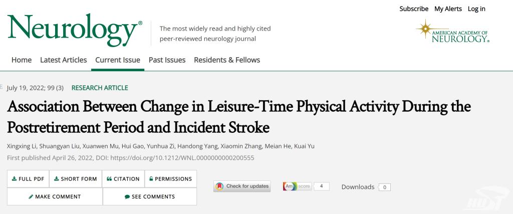導(dǎo)讀:近日,華中科技大學(xué)公衛(wèi)學(xué)院喻快課題組在Neurology上發(fā)表了題為“Association Between Change in Leisure-Time Physical Activity During the Postretirement Period and Incident Stroke”的研究論文。李星星和劉雙燕為論文的共同第一作者,喻快副研究員為論文通訊作者。此項(xiàng)研究基于東風(fēng)-同濟(jì)隊(duì)列,首次在退休人群中揭示休閑運(yùn)動(dòng)水平升高可顯著降低腦卒中的發(fā)生風(fēng)險(xiǎn),應(yīng)鼓勵(lì)退休人群積極參與休閑運(yùn)動(dòng),以降低腦卒中發(fā)病風(fēng)險(xiǎn),獲得顯著的健康收益。