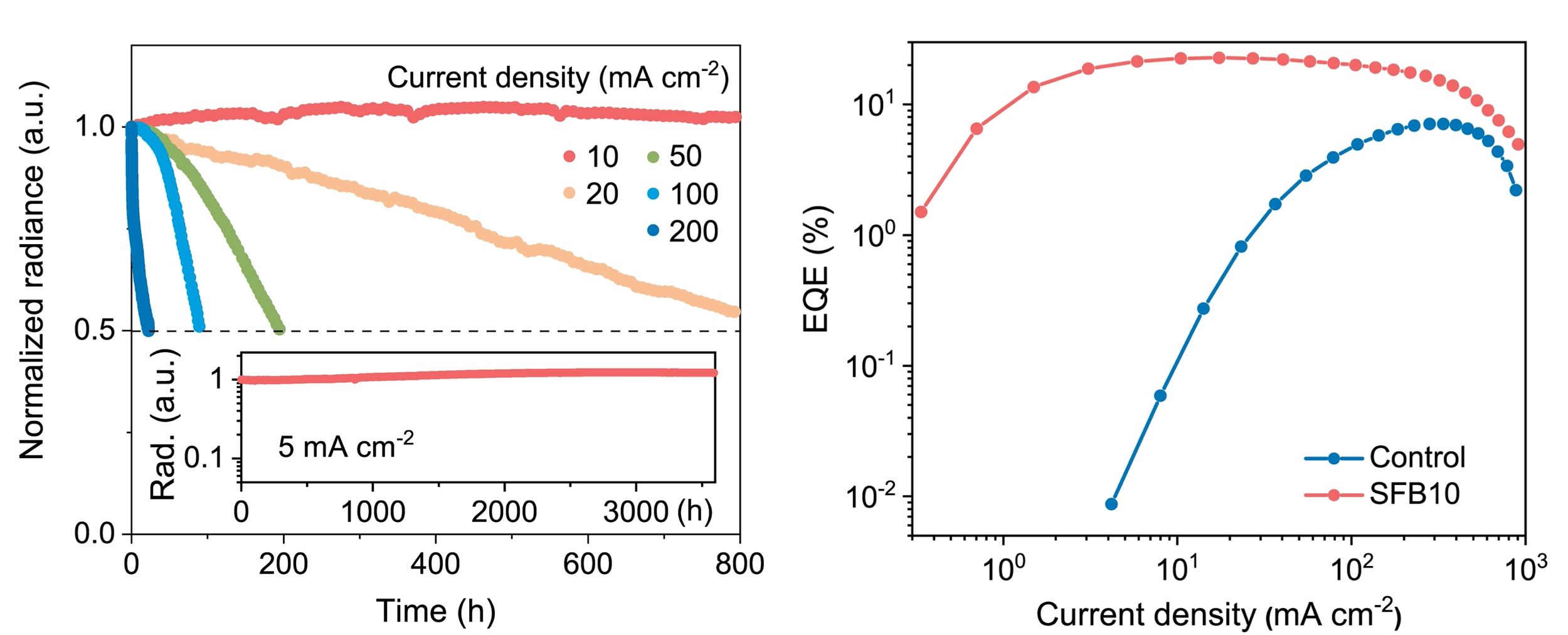鈣鈦礦LED的長(zhǎng)時(shí)間工作與加速老化實(shí)驗(yàn)(左圖);對(duì)照組與穩(wěn)定后器件的外量子效率數(shù)據(jù)(右圖)。來(lái)源: Nature Photonics (2022)。