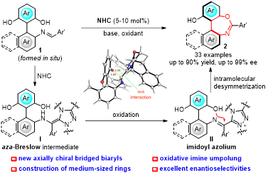 楊星課題組發(fā)現(xiàn):通過氮雜環(huán)卡賓催化活化原位生成的醛亞胺,再經(jīng)由分子內(nèi)去對稱化反應(yīng),最終可獲得含有1,3-氧氮雜卓的新型橋聯(lián)軸手性聯(lián)芳基化合物。反應(yīng)歷程如下:首先,卡賓與亞胺1加成形成aza-Breslow中間體I,這一中間體隨后被氧化劑氧化成更缺電子的中間體II;中間II經(jīng)由分子內(nèi)去對稱化形成最終產(chǎn)物并且循環(huán)催化劑(Figure1)。反應(yīng)底物適用范圍廣,對于含供電子和吸電子取代基的不同底物,均能獲得良好的收率以及優(yōu)異的對映選擇性。