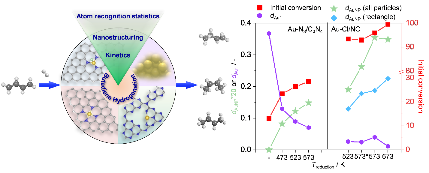 本研究中發(fā)展起來的基于電子顯微鏡大數(shù)據(jù)統(tǒng)計的方法學,對于未來指導設計更高效的多相催化劑具有重要的啟發(fā)。相關研究成果以“Discerning the Contributions of Gold Species in Butadiene Hydrogenation: From Single Atoms to Nanoparticles”為題,發(fā)表在國際化學領域最具影響力的綜合性刊物之一《德國應用化學》(Angewandte Chemie International Edition中科院1區(qū),IF=16.823)上。浙師大杭州高等研究院2020級碩士研究生王奕和2019級碩士研究生王夢茹是該工作的共同第一作者。