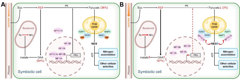 為解析位于線粒體膜上的GmNAS1和GmNAP1調(diào)控根瘤固氮能力的機(jī)制,作者通過免疫共沉淀偶聯(lián)質(zhì)譜分析鑒定到了一個(gè)與GmNAS1和GmNAP1相互作用的轉(zhuǎn)錄因子NF-YC亞基(Nuclear Factor-Y C subunit)GmNFYC10a。發(fā)現(xiàn)在根瘤能量狀態(tài)上升時(shí),AMP水平下降形成的GmNAS1-GmNAS1和GmNAP1-GmNAP1同源二聚體會(huì)與GmNFYC10a互作并將其錨定到線粒體上,從而減少細(xì)胞核中的GmNFYC10a水平,抑制丙酮酸激酶(PK)基因表達(dá)(圖2),調(diào)控能量在植物細(xì)胞和類菌體碳源供應(yīng)之間的分配。