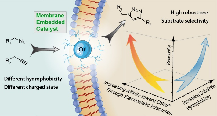 嵌在細(xì)胞膜上的催化劑的工作示意圖。右側(cè)的3D圖展示了該催化劑的催化特性:底物與催化劑的庫(kù)倫親和力或疏水親和力越強(qiáng),催化效果越好。