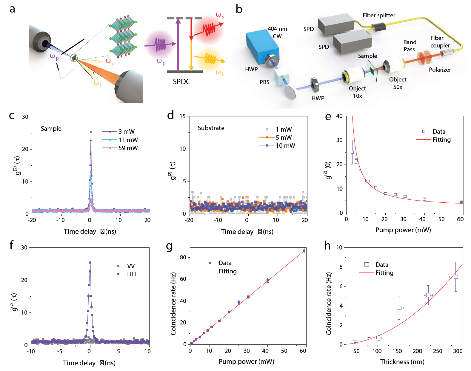 合作者們進一步測試了多層NbOCl2二維材料的自發(fā)參量下轉換過程。實驗中采用404 nm波長的連續(xù)激光器(最大泵浦功率59 mW)泵浦二維材料,收集下轉換過程所產生的808 nm附近波長參量光。二階關聯(lián)函數(shù)g(2)測試結果遠遠超過2,證明該過程產生了非經典關聯(lián)的光子對。合作者們也對參量光信號強度隨二維材料厚度的變化關系進行了測量,實驗結果和理論預期完全吻合。值得注意的是,實驗中證實厚度低至46 nm的該材料也能制備量子光源,這是目前國際報道的最薄的非線性量子光源。這項研究不僅為光學量子信息研究提供了一種可集成的量子光源,也為二維材料的非線性研究開辟了一個新的方向。