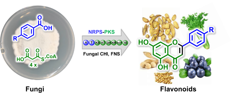 Wei Zhang, Xuan Zhang, Dandan Feng, Yajing Liang, Zhenying Wu, Siyu Du, Yu Zhou, Ce Geng, Ping Men, Chunxiang Fu, Xuenian Huang*, Xuefeng Lu*. Discovery of a Unique Flavonoid Biosynthesis Mechanism in Fungi by Genome Mining. Angew. Chem. Int. Ed. 2023, e202215529.
