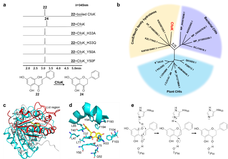 在此基礎(chǔ)上,通過基因敲除和體外酶活實(shí)驗(yàn)發(fā)現(xiàn)CfoK催化查耳酮關(guān)環(huán)生成黃烷酮,這與植物中的CHI具有相同的功能。但是CfoK與目前已經(jīng)發(fā)現(xiàn)的CHI存在不同的進(jìn)化關(guān)系。基于AlphaFold2預(yù)測的蛋白質(zhì)結(jié)構(gòu)模擬和定點(diǎn)突變實(shí)驗(yàn)表明CfoK通過His33介導(dǎo)的酸堿催化誘發(fā)查耳酮發(fā)生Oxa-Michael加成反應(yīng),以6-endo-trig關(guān)環(huán)方式形成構(gòu)型專一的黃烷酮(圖4),這一機(jī)制不同于植物CHI中水介導(dǎo)的催化過程,因此CfoK是一種新穎的真菌查耳酮異構(gòu)酶。