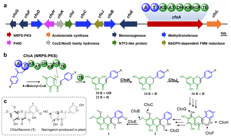 植物黃酮的生物合成途徑目前已經(jīng)研究清楚,首先是查耳酮合酶(CHS)III型PKS以對羥基肉桂酰輔酶A為起始單元與3分子乙酰輔酶A縮合形成查耳酮;然后在查耳酮異構(gòu)酶(CHI)作用下形成黃烷酮,由黃酮合酶(FNS)進(jìn)一步催化黃烷酮形成黃酮骨架,最后在修飾酶的作用下形成多種多樣的黃酮類化合物。本研究中通過基因敲除、同位素標(biāo)記實(shí)驗(yàn)發(fā)現(xiàn)亮白曲霉中查爾酮骨架由NRPS-PKS雜合酶CfoA以苯甲酸或?qū)αu基苯甲酸為起始單元與4分子乙酰輔酶A縮合形成,而非是植物的III型PKS裝配模式,說明真菌黃酮骨架合成機(jī)制與植物存在顯著差異。