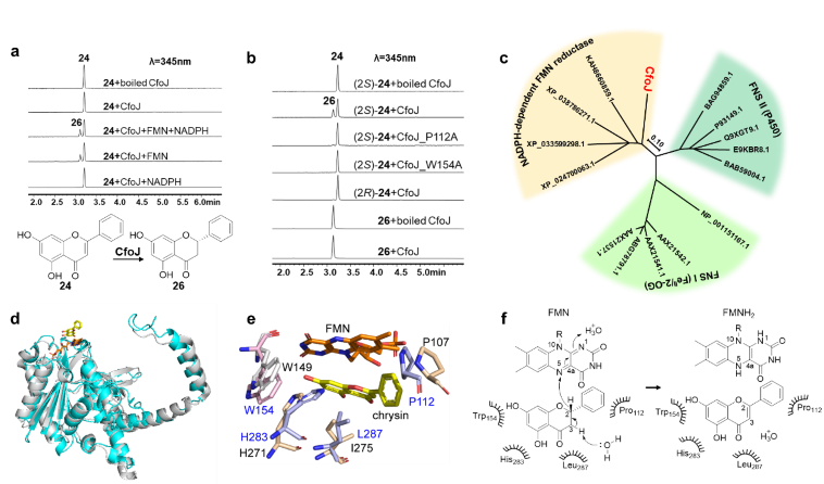 亮白曲霉中由黃素依賴型氧化還原酶CfoJ行使黃酮合酶(FNS)功能,將黃烷酮轉(zhuǎn)化為黃酮,進(jìn)化樹分析顯示其與已知的FNS I (2-酮戊二酸依賴型雙加氧酶)和FNS II(細(xì)胞色素氧化酶P450)處于不同的分支。蛋白質(zhì)結(jié)構(gòu)預(yù)測和定點(diǎn)突變實(shí)驗(yàn)結(jié)果顯示CfoJ是通過典型的黃素依賴型氧化還原酶催化機(jī)制介導(dǎo)C2-C3位的脫氫,將黃烷酮轉(zhuǎn)化為黃酮,這與植物FNS的自由基催化機(jī)制完全不同,因此CfoJ是一種新型的真菌黃酮合酶(圖5)。