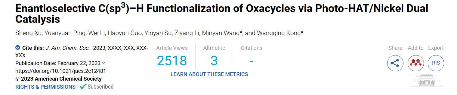 2月22日,Journal of the American Chemical Society《美國化學會志》在線發(fā)表了高等研究院孔望清教授課題組在光-HAT/鎳協(xié)同催化C(sp3)-H不對稱轉(zhuǎn)化研究的最新研究成果,論文題為“Enantioselective C(sp3)–H Functionalization of Oxacycles via Photo-HAT/Nickel Dual Catalysis”(《 光鎳協(xié)同催化實現(xiàn)氧雜環(huán)C(sp3)-H對映選擇性官能團化反應》)。高等研究院2018級直博生許盛為第一作者,高等研究院孔望清教授和南京大學王敏燕教授為論文的共同通訊作者,高等研究院為論文的第一署名單位。