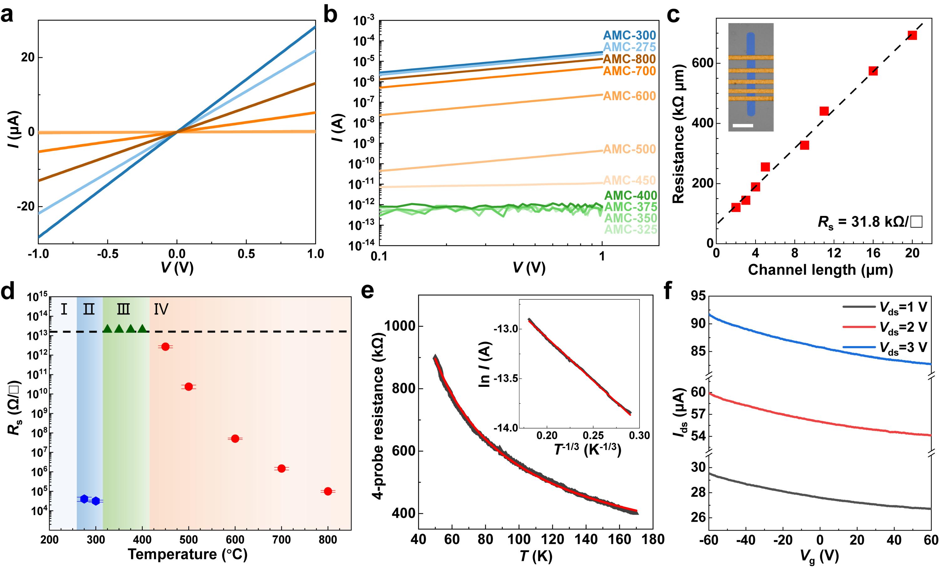 在電學(xué)性質(zhì)的測量中,研究人員發(fā)現(xiàn)了AMC材料的高度溫度依賴特性:在較低溫度下(275-300 ℃)AMC具有微弱的中程序而呈現(xiàn)高導(dǎo)電性(方塊電阻Rs:32 kΩpersquare)、325 ℃得到的樣品則變?yōu)榻^緣態(tài)、進一步升高溫度后,Rs與生長溫度負相關(guān)。研究人員最終實現(xiàn)了AMC導(dǎo)電性在9個數(shù)量級中的連續(xù)可調(diào)。