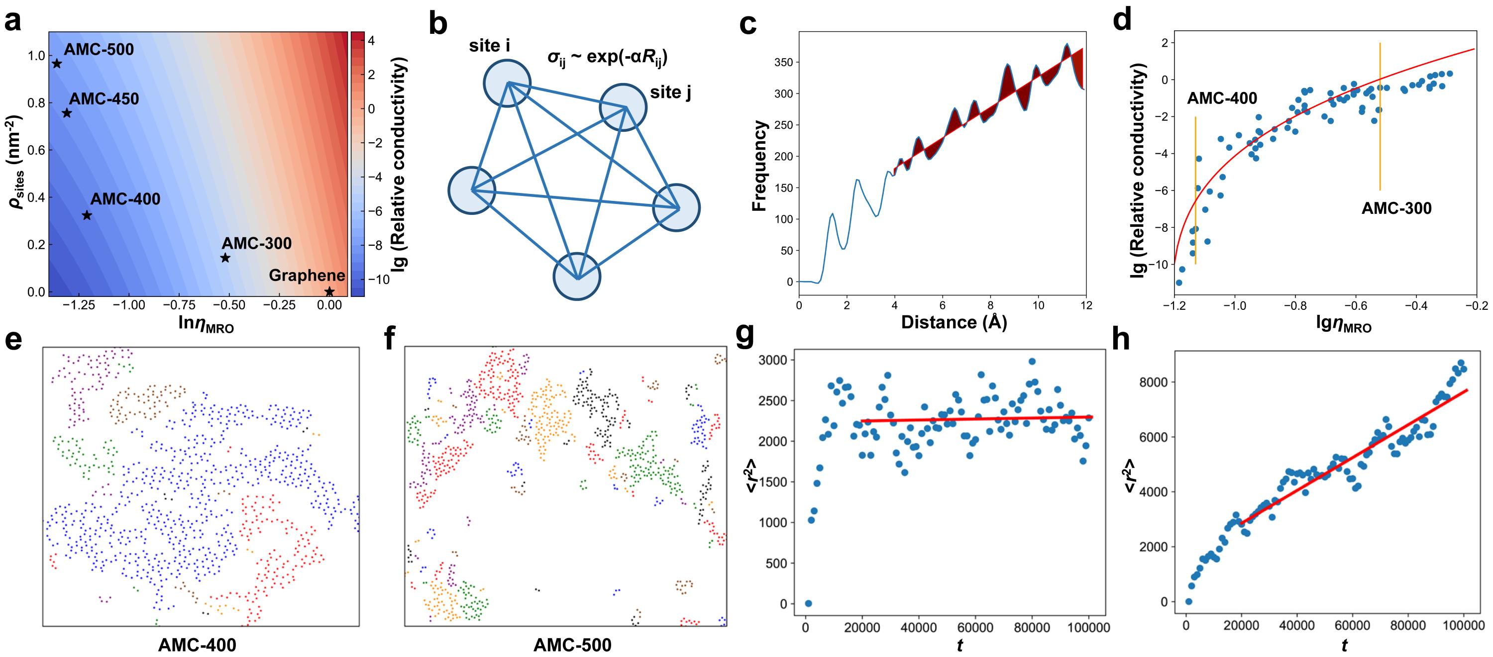研究人員利用密度泛函理論計算和蒙特卡洛計算成功關(guān)聯(lián)了二維非晶碳的原子結(jié)構(gòu)和電學(xué)性質(zhì),揭示了AMC導(dǎo)電性差異的微觀機理:AMC-300與AMC-400導(dǎo)電性差異的主要來源是中程序的有無;AMC-400和AMC-500的中程序差異不大,其導(dǎo)電性的差異則主要源于納米晶區(qū)域的密度。為此,研究人員引入了一個新的結(jié)構(gòu)序參量—跳躍島密度;結(jié)合中程序,成功繪制了“微觀結(jié)構(gòu)-宏觀導(dǎo)電性能”相圖。這一發(fā)現(xiàn)也表明了非晶材料無序度的復(fù)雜性,難以直接用中程序完備描述其構(gòu)效關(guān)系。該工作首次在一個非晶材料實例中實現(xiàn)了精準的構(gòu)效關(guān)系,為二維材料、非晶材料物理及應(yīng)用等領(lǐng)域提供了全新思路。