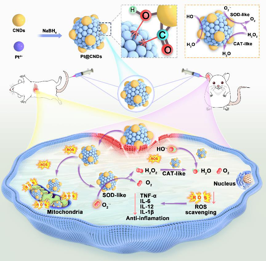 生物體內(nèi)存在級(jí)聯(lián)催化反應(yīng),即在連鎖的酶促反應(yīng)過(guò)程中,前一反應(yīng)的產(chǎn)物是后一反應(yīng)的底物,每進(jìn)行一次催化反應(yīng),就使調(diào)節(jié)信號(hào)產(chǎn)生一次放大作用。生物體內(nèi)的級(jí)聯(lián)催化反應(yīng)系統(tǒng)通過(guò)將多種酶限制在亞細(xì)胞區(qū)室中來(lái)確保準(zhǔn)確的信號(hào)轉(zhuǎn)導(dǎo)和有效的代謝。通過(guò)降低擴(kuò)散勢(shì)壘、提高中間體的局部濃度和改善整個(gè)反應(yīng)的原子經(jīng)濟(jì)性,獲得了優(yōu)于傳統(tǒng)多步反應(yīng)的優(yōu)勢(shì)。課題組將高活性碳點(diǎn)SOD納米酶(CNDs)與鉑納米顆粒(Pt)結(jié)合,設(shè)計(jì)開發(fā)了一種具有高效級(jí)聯(lián)(SOD-CAT)納米酶活性的Pt@CNDs納米酶,不僅解決碳點(diǎn)SOD納米酶催化產(chǎn)物(H2O2)的氧化毒性問(wèn)題,最終將自由基轉(zhuǎn)化為生物安全的水和氧氣,發(fā)揮級(jí)聯(lián)放大催化活性,而且在活體抗炎方面具有優(yōu)異的效果。