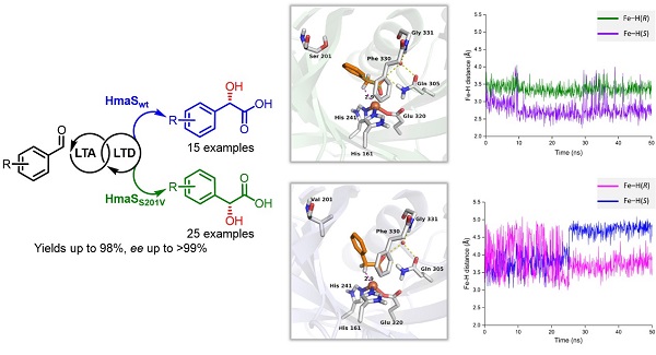 在本研究中,研究人員通過(guò)逆生物合成分析,設(shè)計(jì)了包含L-苯絲氨酸醛縮酶(LTA)、L-苯絲氨酸脫氨酶(LTD)和4-羥基扁桃酸合成酶(HmaS)的三酶級(jí)聯(lián)反應(yīng),并通過(guò)文獻(xiàn)和數(shù)據(jù)庫(kù)挖掘,對(duì)上述酶進(jìn)行了篩選,組合優(yōu)化在體外構(gòu)建了三酶級(jí)聯(lián)反應(yīng)。研究人員首次發(fā)現(xiàn)了HmaS催化活性口袋中關(guān)鍵氨基酸殘基的突變體AoHmaSS201V相較于AoHmaSwt顯示出對(duì)映選擇性完全反轉(zhuǎn)的結(jié)果,通過(guò)分子對(duì)接和分子動(dòng)力學(xué)模擬實(shí)驗(yàn),初步闡釋了對(duì)映選擇性翻轉(zhuǎn)的可能酶分子機(jī)制。研究人員利用對(duì)映選擇性反轉(zhuǎn)的突變體,同時(shí)成功實(shí)現(xiàn)了S-和R-型扁桃酸類(lèi)化合物的高效合成。