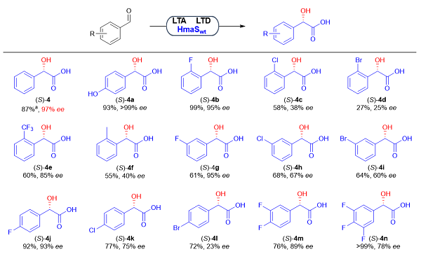 通過(guò)本項(xiàng)研究,合作團(tuán)隊(duì)開(kāi)發(fā)了高效的生物催化級(jí)聯(lián)反應(yīng)和工程菌,從易得原料苯甲醛及甘氨酸出發(fā),以高產(chǎn)率和高對(duì)映選擇性獲得各種手性扁桃酸衍生物,該方法無(wú)需額外添加輔助因子,為扁桃酸類(lèi)化合物的不對(duì)稱(chēng)合成提供了無(wú)氰化物的綠色生物合成新技術(shù)。