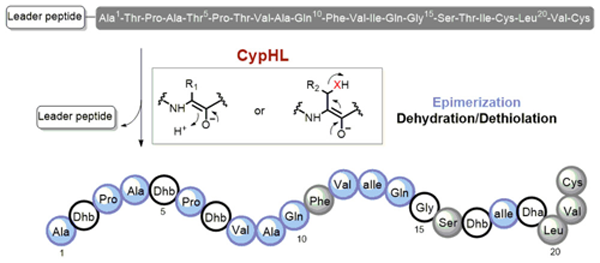 圖:Fig 1. 林那羅定肽生物合成中的脫水、脫硫和異構(gòu)化反應(yīng)