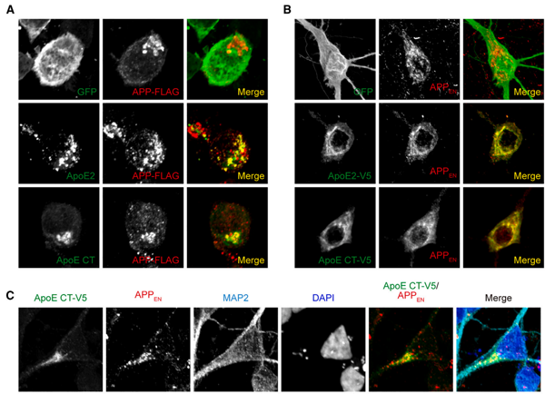 阿爾茨海默?。ˋlzheimer’s disease,AD)是一種常見的神經(jīng)退行性疾病,可影響大腦認知、記憶能力。目前AD致病機制的認知多來源于對家族遺傳性AD(fAD)的研究。淀粉樣前體蛋白(APP)和γ分泌酶的酶切活性中心(PS1和PS2)的一些突變加速淀粉樣斑塊的形成,最終導致fAD。但fAD僅占所有AD的~1%,另外~99%是非家族遺傳性的散發(fā)性AD(sAD)。sAD患者并不攜帶導致fAD的APP或者PS1/2突變。載脂蛋白E4(ApoE4)是sAD最大的風險因子。約有14%的人攜帶至少一個ApoE4基因。攜帶兩個ApoE4拷貝的人與攜帶正常ApoE3的人相比,患AD的風險增加十倍,并且患病年齡提前至70歲之前,病患程度也大大增加。而ApoE2卻能顯著降低AD的發(fā)病風險。雖然對AD的影響截然不同,但ApoE2,ApoE3和ApoE4的氨基酸序列僅有1-2個位點的不同。目前并不清楚為什么同一基因編碼的不同ApoE異構體在AD進程中發(fā)揮著截然相反的影響。sAD風險基因ApoE與fAD致病基因APP和PS1/2之間是否有功能上的聯(lián)系也是不清楚的。