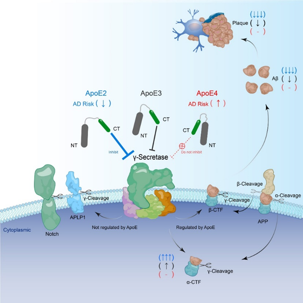 陳椰林課題組發(fā)現(xiàn)ApoE異構體帶來的致病風險與其直接特異性抑制APP的γ剪切活性相關,提出了ApoE異構體改變AD風險的新理論。具有保護作用的ApoE2具有最強的抑制活性,而增加患病風險的ApoE4則失去了該活性,因此兩者在AD疾病進程中功能截然不同。該理論首次將fAD的致病基因和sAD的風險基因從功能上直接聯(lián)系在一起,提示APP的γ酶切異常是fAD和sAD共同的致病原因。