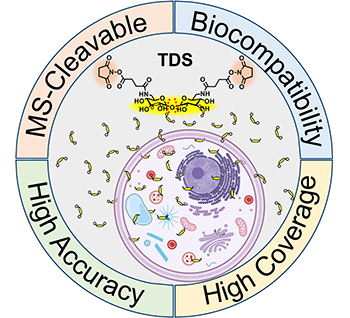 本工作中,該團隊基于糖分子的高生物兼容性和糖苷鍵的質譜可碎裂特征,將糖苷鍵引入到功能交聯(lián)劑的骨架設計中,篩選并獲得了高生物兼容性的海藻糖作為骨架分子,研制了質譜可碎裂型交聯(lián)劑——海藻糖二琥珀酰亞胺酯(TDS)。該交聯(lián)劑較目前已報道的可透膜型化學交聯(lián)劑,展示了更加優(yōu)異的細胞活性維持能力,可在低擾動狀態(tài)下實現細胞內蛋白質復合物的高效交聯(lián)。在此基礎上,低能量的糖苷鍵—高能量的肽鍵的質譜選擇性碎裂模式,可以將“工字形”的交聯(lián)肽段數據分析降冪為常規(guī)交聯(lián)劑片段修飾的線性肽段數據檢索,極大地降低了交聯(lián)肽段譜圖分析的復雜性,顯著地提高了交聯(lián)肽段的鑒定效率與準確度。團隊從Hela細胞中鑒定到對應于3500對以上交聯(lián)肽段的1453個蛋白質的構象,以及843對蛋白質間的相互作用信息,實現了活細胞中蛋白質復合物的原位交聯(lián)與規(guī)?;治?,為活細胞中蛋白質功能的調控提供了重要的技術支撐和關鍵的互作位點信息。