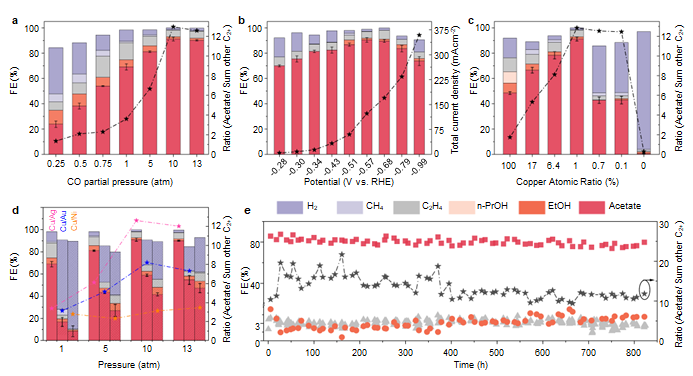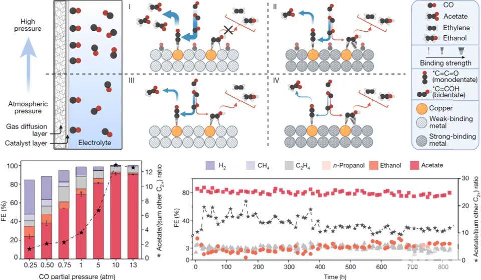該論文報道了一種新型稀釋合金催化劑,可在高壓強反應(yīng)條件下將一氧化碳高效還原為乙酸。反應(yīng)最高選擇性(法拉第效率)達91%,已和二氧化碳至一氧化碳的電還原選擇性相仿;能量轉(zhuǎn)化效率達34%,為現(xiàn)有紀錄兩倍左右;長時運行可保持80%左右選擇性820小時以上,大大超越現(xiàn)有紀錄。