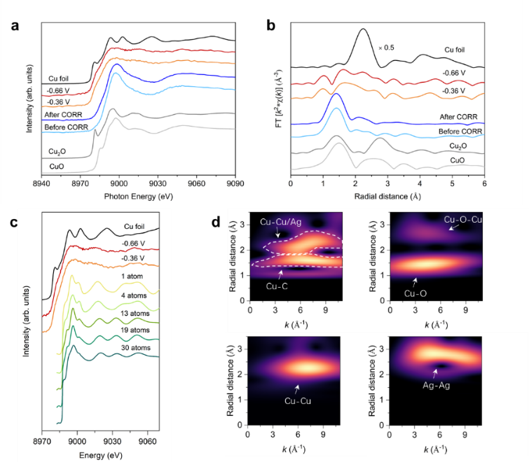 圖3.銅-銀稀釋合金催化劑的同步輻射原位表征,進一步探索了銅元素在稀釋合金中的分散狀態(tài):銅團簇的大小大約在2-4個原子之間。