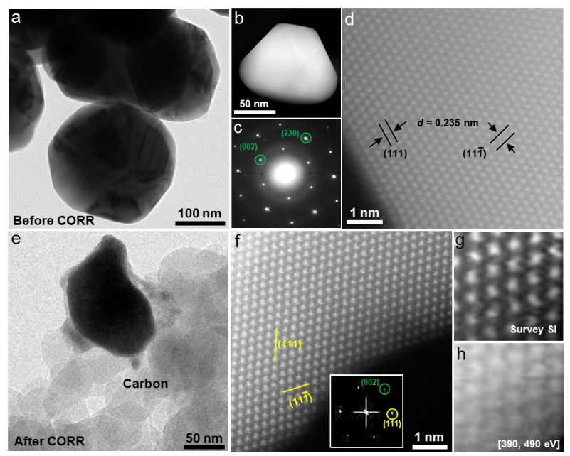 圖2.銅-銀稀釋合金催化劑的透射電鏡表征,其中只觀察到銀的晶格,表明銅元素在其中以原子級團簇進行分散。