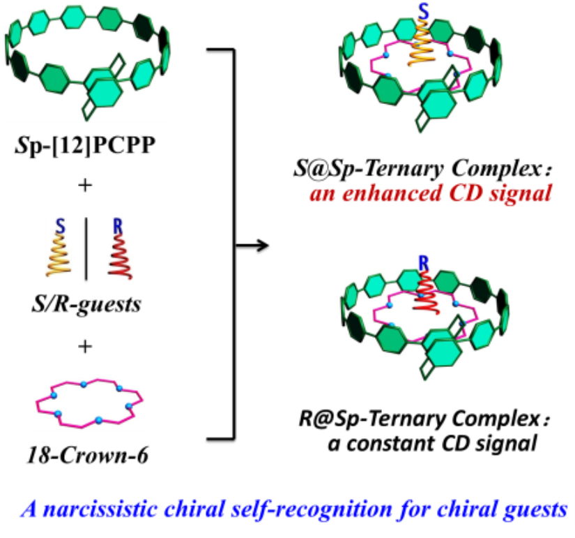 近日,北京師范大學化學學院江華教授課題組報道了基于[2.2]對環(huán)芳烷([2.2]PCP)的手性碳納米環(huán),并將其應用于手性三元絡合物的分級自組裝及其自戀性手性識別中。眾所周知,取代的[2.2]PCP由于其不同的取向而表現(xiàn)出較好的結(jié)構多樣性和穩(wěn)定的手性?;诖?,作者將[2.2]PCP作為手性基元引入到CPP中,合成了手性碳納米環(huán)(Sp/Rp-[12]PCPPs)。同時,作者發(fā)現(xiàn)Sp/Rp-[12]PCPPs不僅可以包結(jié)18-Crown-6形成環(huán)中環(huán)型二元絡合物,也可以包結(jié)18-Crwon-6和質(zhì)子化手性胺絡合物形成手性三元絡合物:即同手性S@Sp-/R@Rp-和異手性R@Sp-/S@Rp-三元絡合物。這些三元手性絡合物表現(xiàn)出不同的CD響應信號,為自戀性手性自識別奠定基礎。