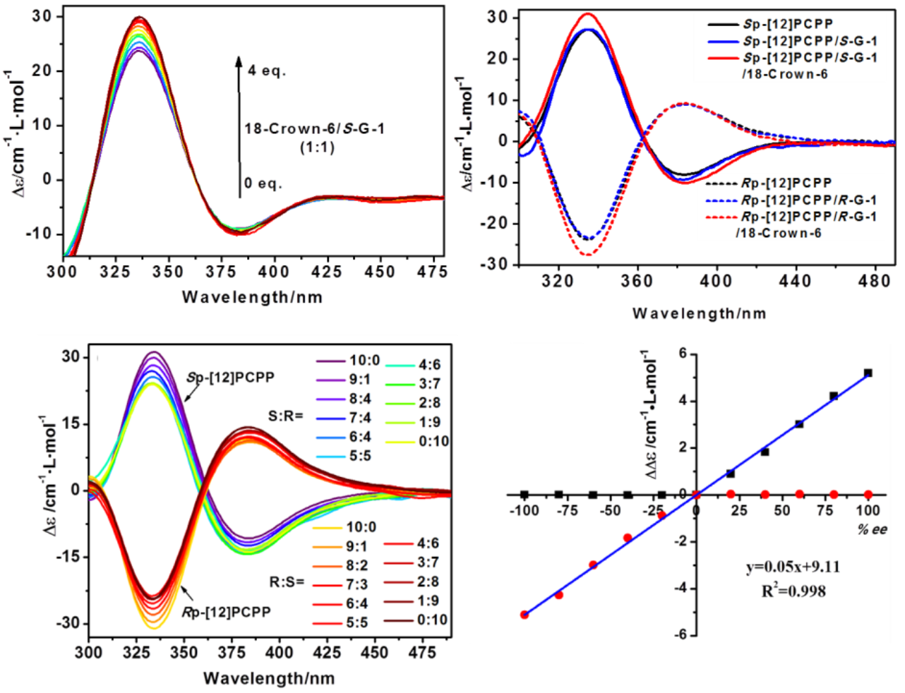 之后,作者發(fā)現(xiàn)隨著18-Crown-6/S-guests絡合物在Sp-[12]PCPP中的增加,引起了其在340nm處CD信號的增強。而18-Crown-6/R-guests的加入并不能引起Sp-[12]PCPP的CD信號的變化,這說明了同手性R@Rp-/S@Sp-三元絡合物分別對S/R-質(zhì)子化胺具有較好的自戀性手性識別能力,可用于質(zhì)子化手性胺的對映選擇性識別。同時,對照實驗顯示18-Crown-6在手性三元絡合物的構建中扮演著不可或缺的角色。最后,手性三元絡合物被進一步用于確定手性客體分子的ee值。這一發(fā)現(xiàn)突出了手性碳納米環(huán)在構建新型手性三元絡合物方面新的用途,拓展了碳納米環(huán)結(jié)構在超分子化學和材料科學中的應用。